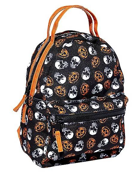 Add a festive look to your costume or carry this stylish skull and pumpkin mini backpack with you to show how much you love Halloween. With a front zipper compartment along with a main compartment and a convenient handle, this small backpack is the perfect seasonal accessory.
